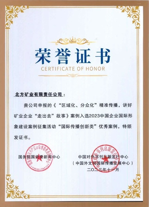 論壇上,“2023中國企業國際形象建設案例征集活動”評選結果揭曉。評選活動以“挖掘典型案例、建設企業形象、講好中國故事”為宗旨,從來自中央企業、地方國企及民營企業報送的251個有效案例中遴選出“共建新絲路”“跨文化融合”“國際傳播創新”“筑夢人物故事”四類專項優秀案例共40個。中國兵器工業集團北方公司北方礦業有限責任公司案例《“區域化、分眾化”精準傳播,講好礦業企業“走出去”故事》入選“國際傳播創新類”優秀案例。